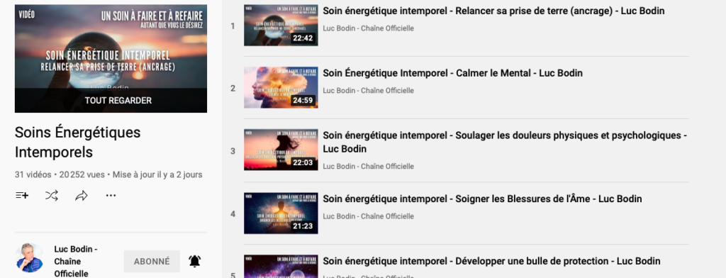 Sur la chaîne YouTube de Luc Bodin, vous trouverez des soins énergétiques et intemporels qui sont proposés pour notre plus grand bien. Ils sont organisés par thématiques. Il vous suffit de choisir celui (ou ceux) qui vous semble(ent) le plus adapté(s) à votre situation. Après quelques explications, Luc Bodin fait son soin pendant lequel il dispense une musique qui vous facilite le lâcher-prise et la relaxation. N’hésitez pas à faire cette belle expérience et à partager.